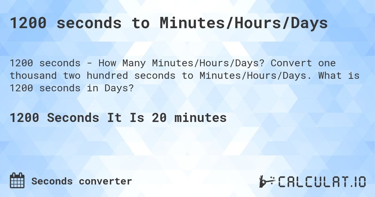 There are 20 minutes in 1200 seconds. To convert seconds to minutes, you simply divide the number of seconds by 60 since there are 60 seconds in a minute.